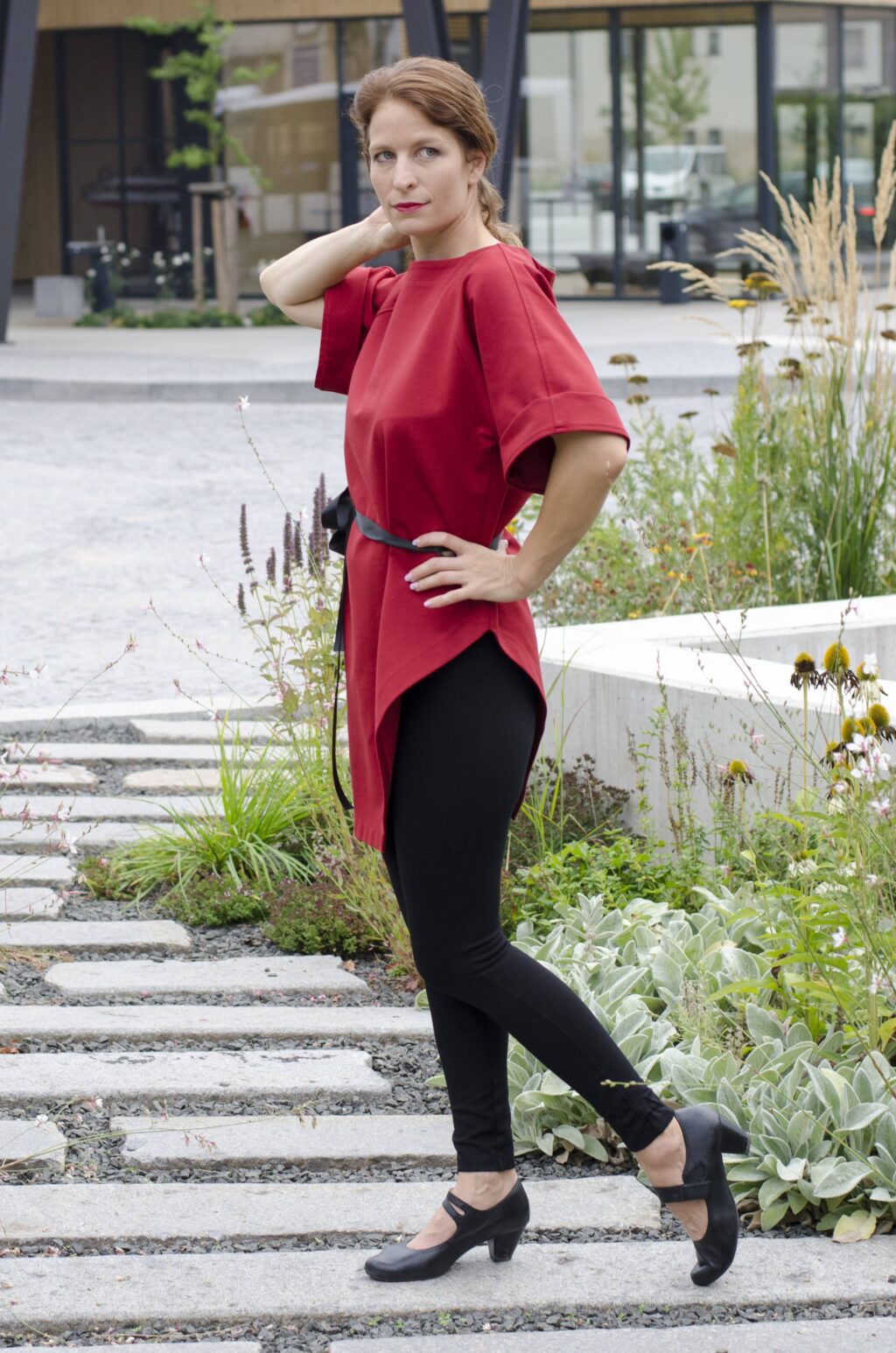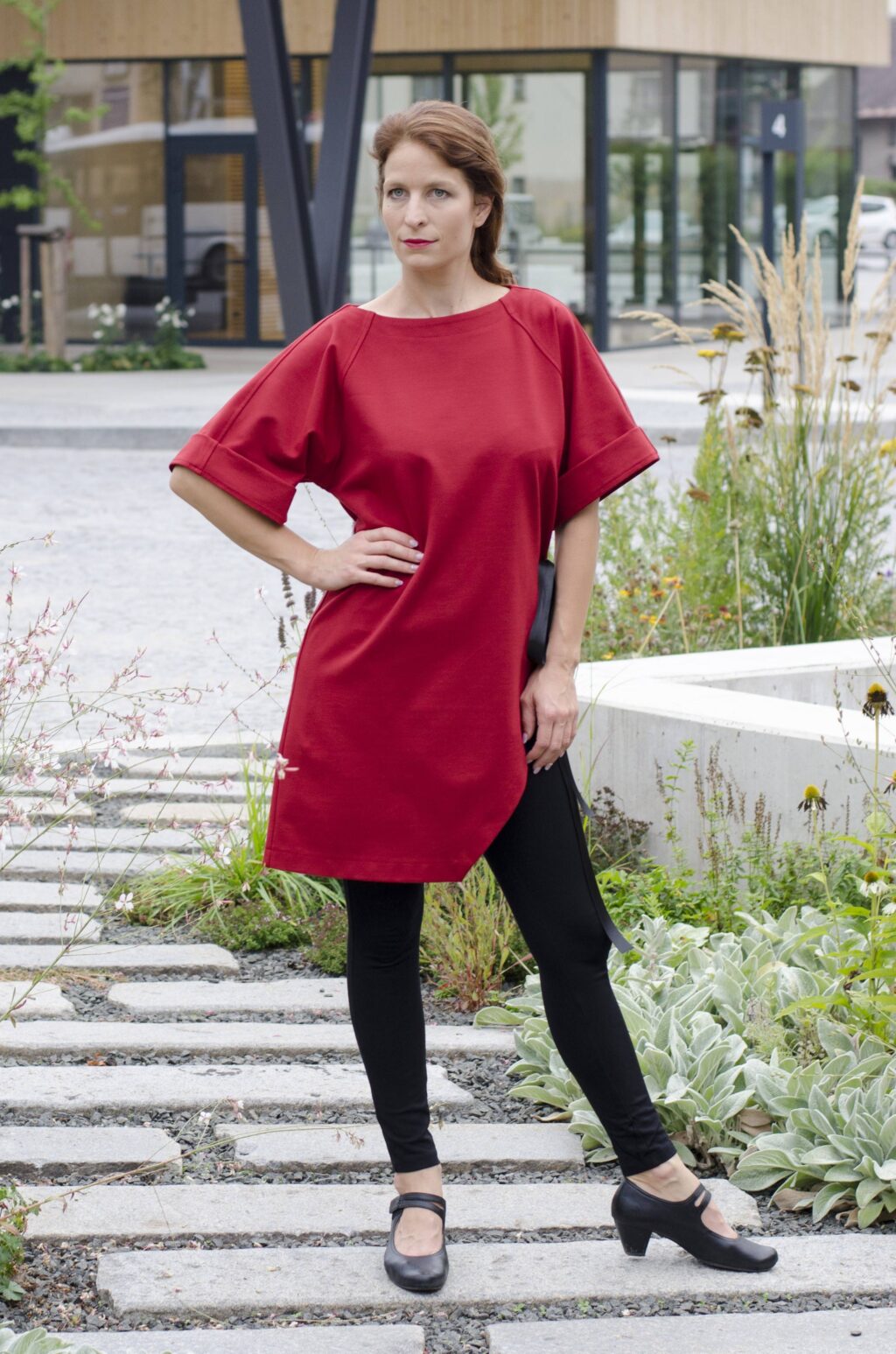 Moderní dámská červená tunika z příjemného materiálu vyrobená v naší krejčovské dílně v Podkrkonoší.