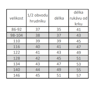 - Tabulka velikostí